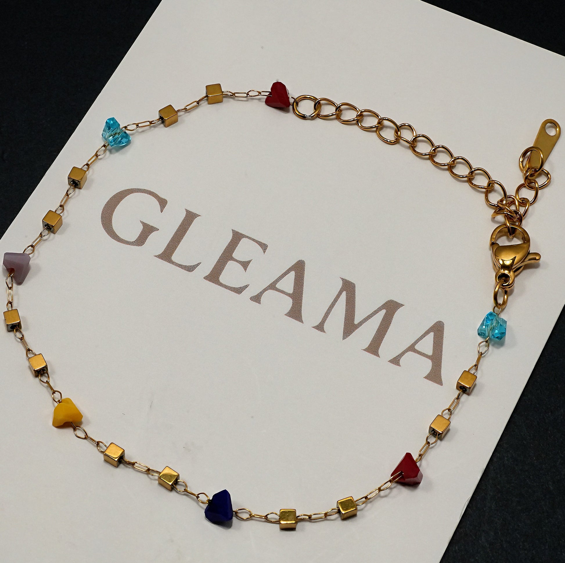 Like the rhythm of festival drums and the swirl of confetti, Carnival Steps dances on your wrist with every move. Golden cubes glint between tiny hearts in shades of ruby, sapphire, amber, and turquoise—each a whisper of joy, a spark of celebration.